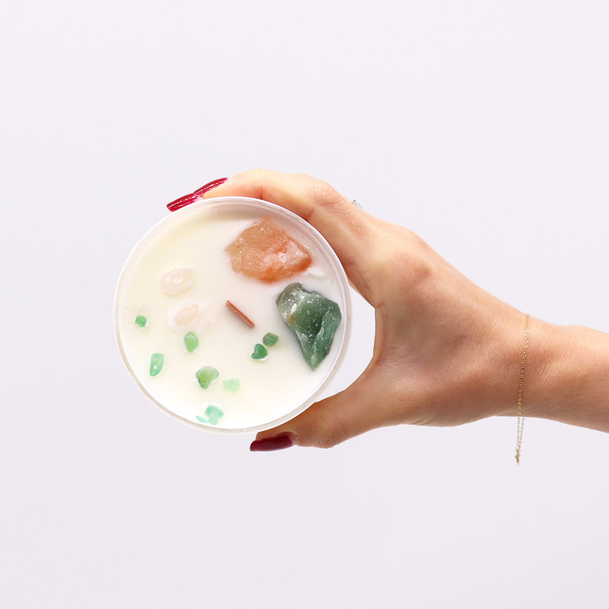 Chaque bougie contient de véritables pierres naturelles, quartz rose et jade, sélectionnées pour leur énergie bienfaisante.