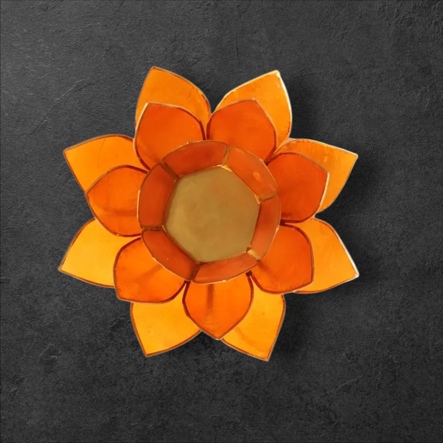 Bougeoir en forme de fleur de lotus, aux teintes vibrantes d’orange et d’or, fabriqué en coquille de Capiz. Symbolisant la pureté et l’harmonie, il représente le chakra sacré, centre de la créativité et des émotions. Idéal pour favoriser l’équilibre émotionnel et l’épanouissement personnel.